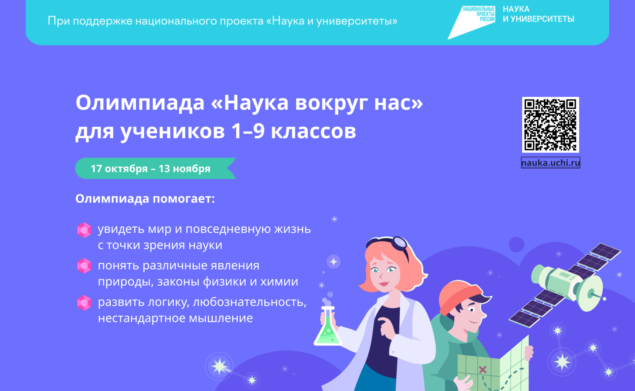 В период с 17 октября по 13 ноября на платформе Учи.ру проводится всероссийская онлайн-олимпиада «Наука вокруг нас» (https://nauka.uchi.ru/) для учеников 1–9 классов. Организаторами выступают платформа Учи.ру и АНО «Национальные приоритеты» при поддержке национального проекта «Наука и университеты». Олимпиада является межпредметной и направлена на повышение интереса школьников к изучению естественных наук.
